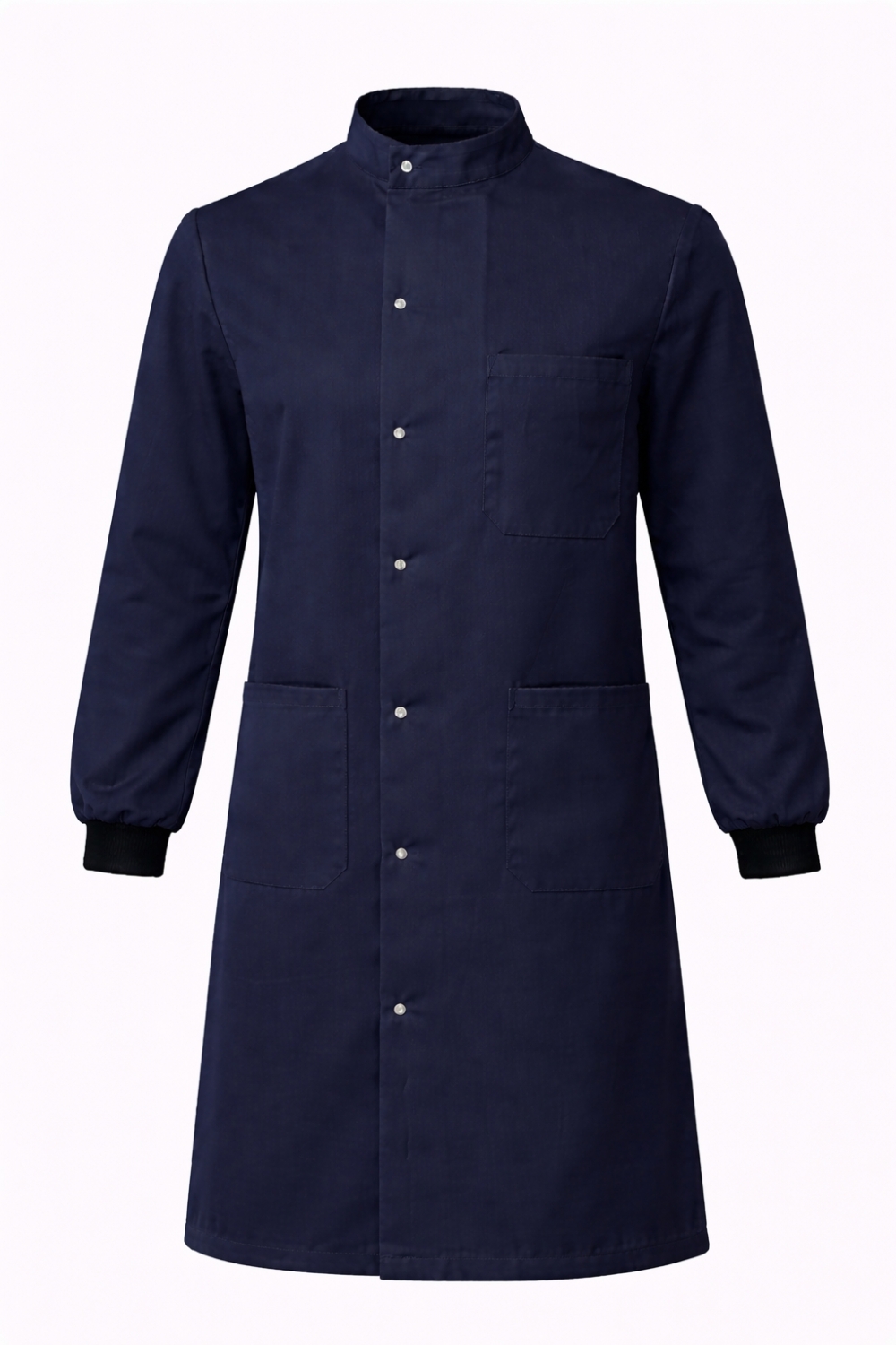 Professional Howie style laboratory coat with stud fastening and rib knit cuffs. Manufactured from durable cotton drill fabric approximately 260-270 GSM providing strength and breathability. Features mandarin collar, chest pocket and two lower pockets for practical storage. Black rib knit cuffs improve sleeve fit and protection. Suitable for laboratories, healthcare environments, education and research facilities. Washable at 30C. Available in a wide range of colours and sizes XS-5XL.