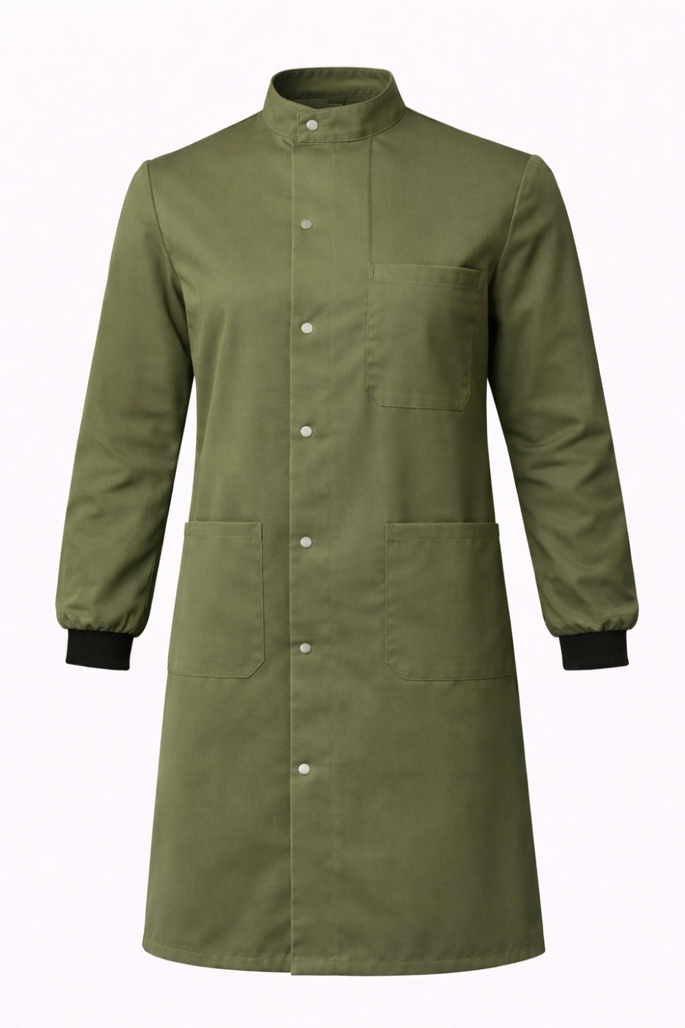 Professional Howie style laboratory coat with stud fastening and rib knit cuffs. Manufactured from durable cotton drill fabric approximately 260-270 GSM providing strength and breathability. Features mandarin collar, chest pocket and two lower pockets for practical storage. Black rib knit cuffs improve sleeve fit and protection. Suitable for laboratories, healthcare environments, education and research facilities. Washable at 30C. Available in a wide range of colours and sizes XS-5XL.