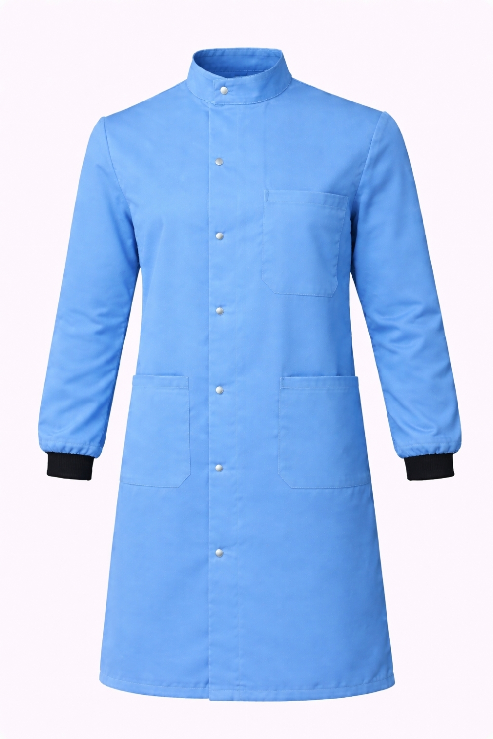 Professional Howie style laboratory coat with stud fastening and rib knit cuffs. Manufactured from durable cotton drill fabric approximately 260-270 GSM providing strength and breathability. Features mandarin collar, chest pocket and two lower pockets for practical storage. Black rib knit cuffs improve sleeve fit and protection. Suitable for laboratories, healthcare environments, education and research facilities. Washable at 30C. Available in a wide range of colours and sizes XS-5XL.