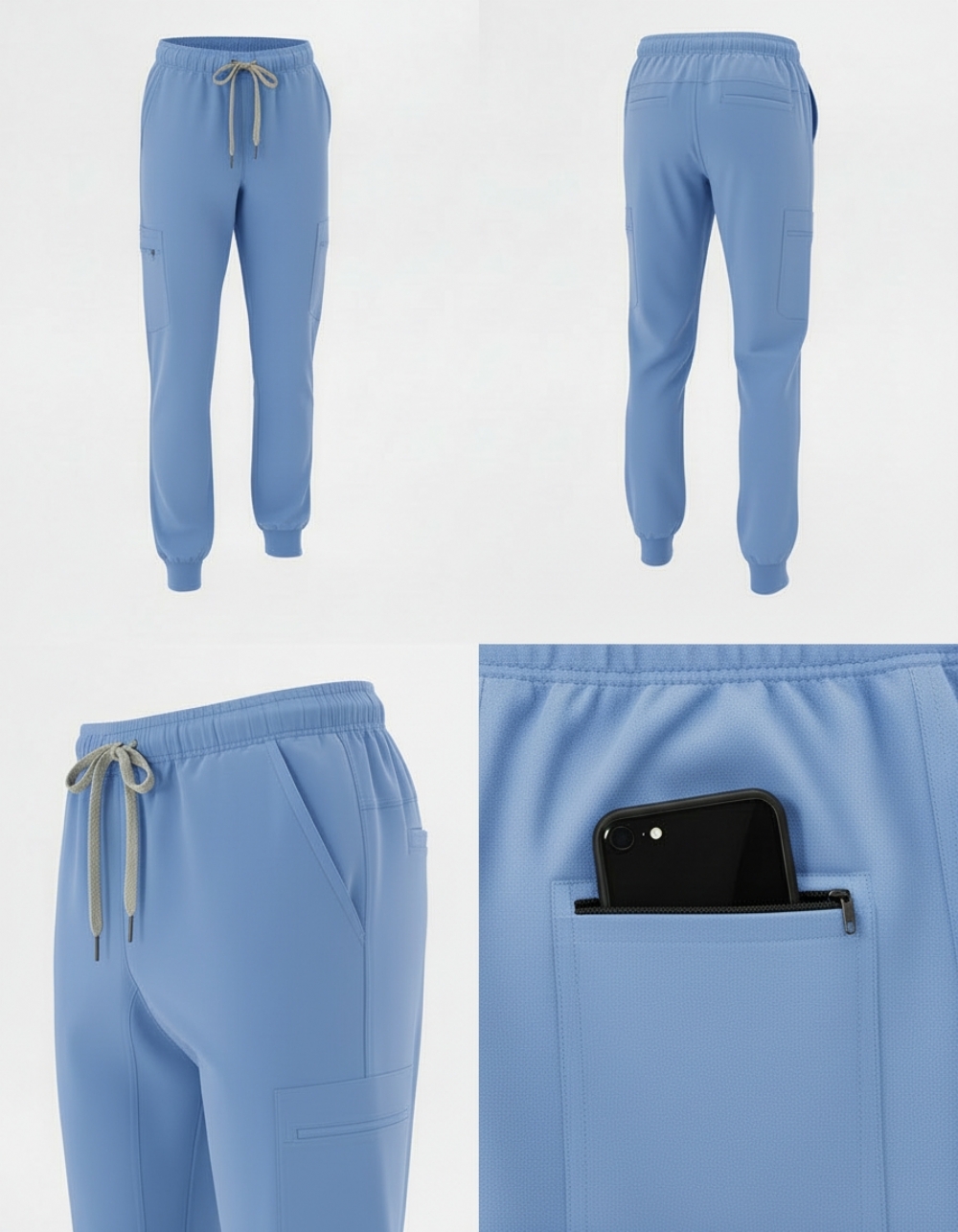 The modern combat-inspired design features a practical six-pocket layout, including two traditional side pockets for daily essentials, two secure zip back pockets for valuables and two thigh-mounted phone pockets designed to safely hold modern smartphones. This layout ensures functionality without compromising a professional clinical appearance.