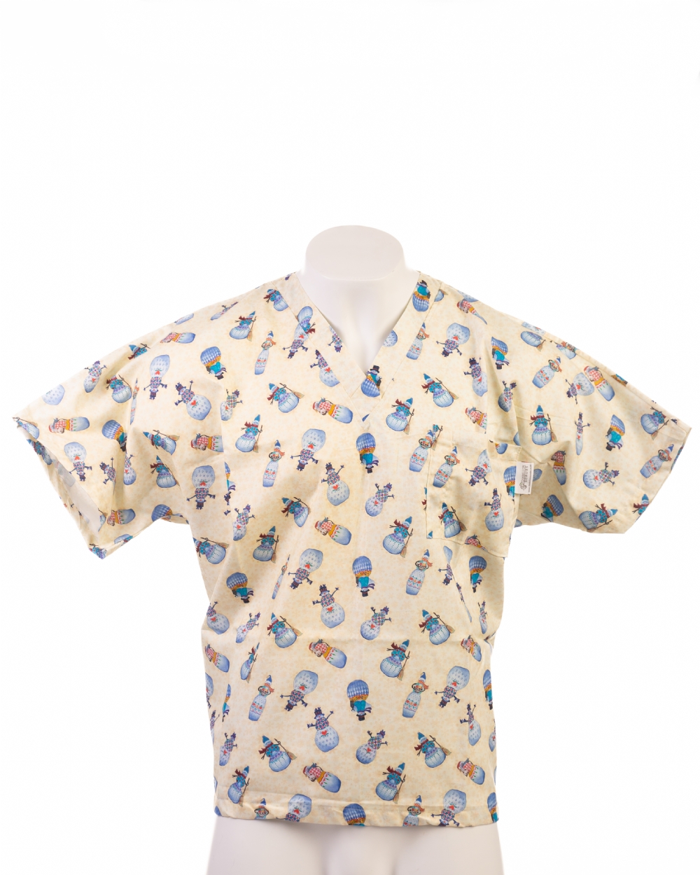 A practical chest pocket offers convenient storage for small essentials or technology, while the vibrant Christmas snowman print helps create a warm, friendly atmosphere for patients, especially in paediatric, care home and community healthcare environments.